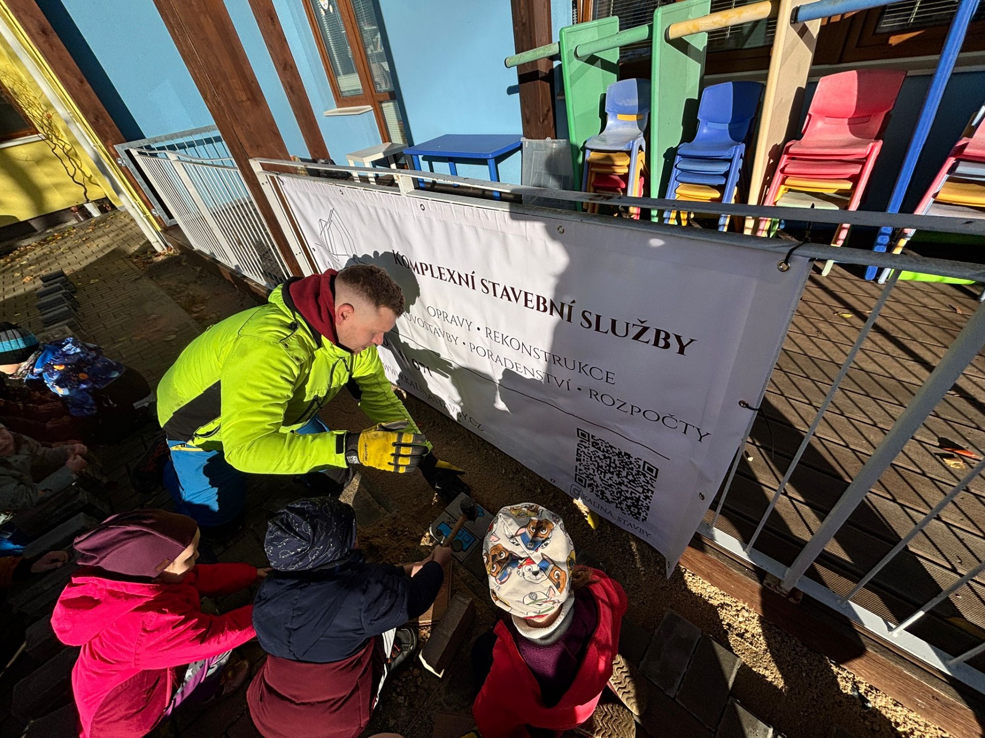 Dne 31. 10. 2025 byla v areálu naší mateřské školy úspěšně dokončena drobná stavební úprava – nový chodníček pro bezpečnější pohyb dětí a pedagogů. Práce byly realizovány bezplatně společností Kalina stavby s.r.o. v rámci projektu "Užitkový automobil stavby s.r.o." podaného v rámci 3. výzvy SZP MAS SDRUŽENÍ RŮŽE. Během akce si děti dlažební kostky pomalovali a následně měli možnost nahlédnout a vyzkoušet si základní postupy při přípravě podloží a pokládce dlažby.